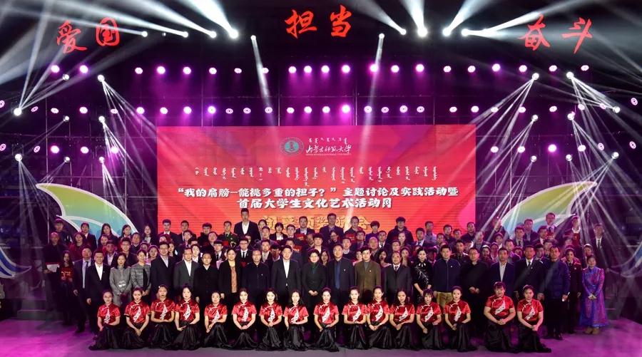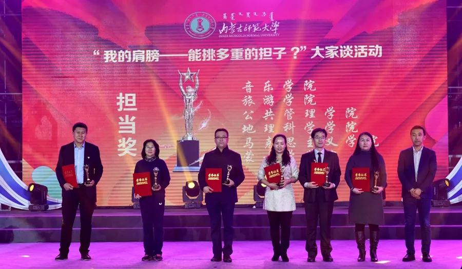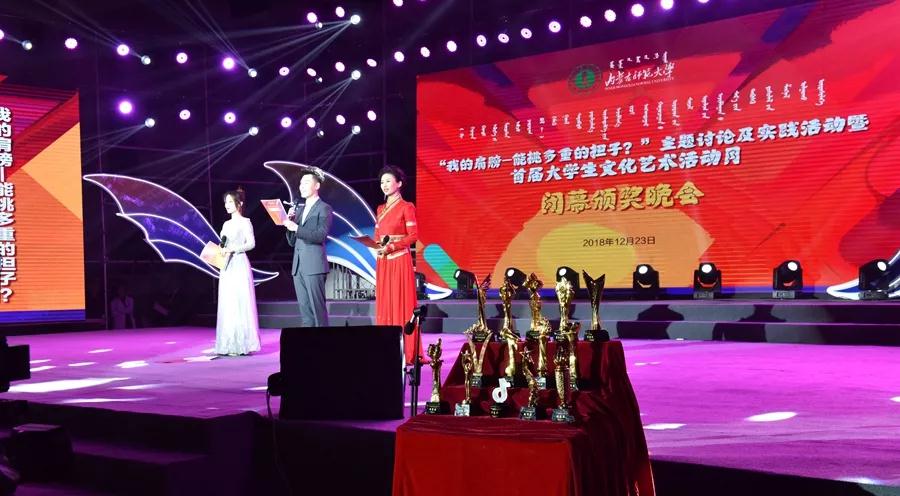 12月23日晚,米兰milan官方网站“我的肩膀——能挑多重的担子?”主题讨论及实践活动暨首届大学生文化艺术活动月颁奖晚会在赛罕校区体育馆举行。校党委书记黄雅丽,党委副书记、纪委书记高云峰,副校长刘九万,党委委员、党委宣传部部长张宝成及相关部门负责同志出席活动并为获奖师生颁奖。米兰官网党总支书记贺瑞,副书记、副院长阿荣,团总支书记范晓刚以及付桂军教授参加了本次活动。