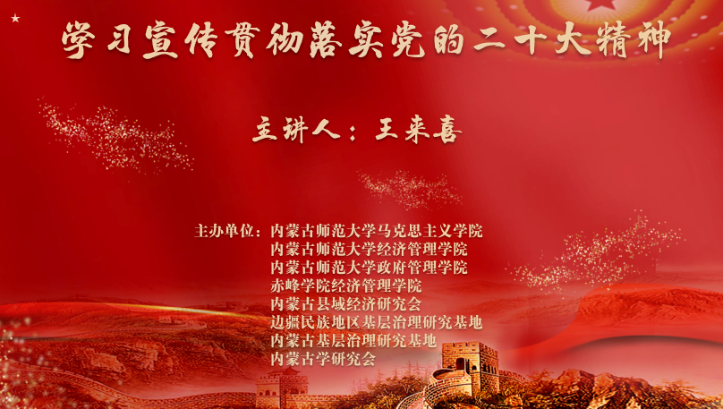 为进一步深入学习宣传贯彻落实党的二十大精神,加强各院校间、研究会、研究基地之间的学术交流,搭建党的二十大精神互学互研平台,12月14日下午,米兰milan官方网站、经济管理学院、政府管理学院、赤峰学院经济与管理学院、内蒙古县域经济研究会、边疆民族地区基层治理研究基地、内蒙古基层治理研究基地、内蒙古学研究会以线上方式联合主办了“学习宣传贯彻落实党的二十大精神”专题讲座,米兰milan官方网站党委书记拓俊杰主持学习。