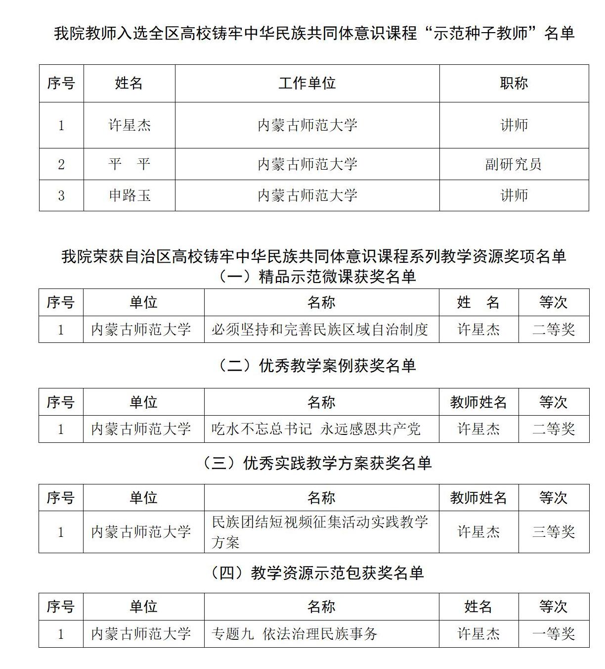 近日,自治区教育厅公布了自治区高校铸牢中华民族共同体意识课程“示范性种子教师”名单和系列教学资源获奖名单,米兰官网铸牢中华民族共同体意识课程教研室3位青年教师许星杰、平平、申路玉被评为“示范性种子教师”;许星杰荣获自治区高校铸牢中华民族共同体意识课程系列教学资源奖项4项,包括“教学资源示范包”一等奖、“精品示范微课”二等奖、“优秀教学案例”二等奖和“优秀实践教学方案”三等奖。