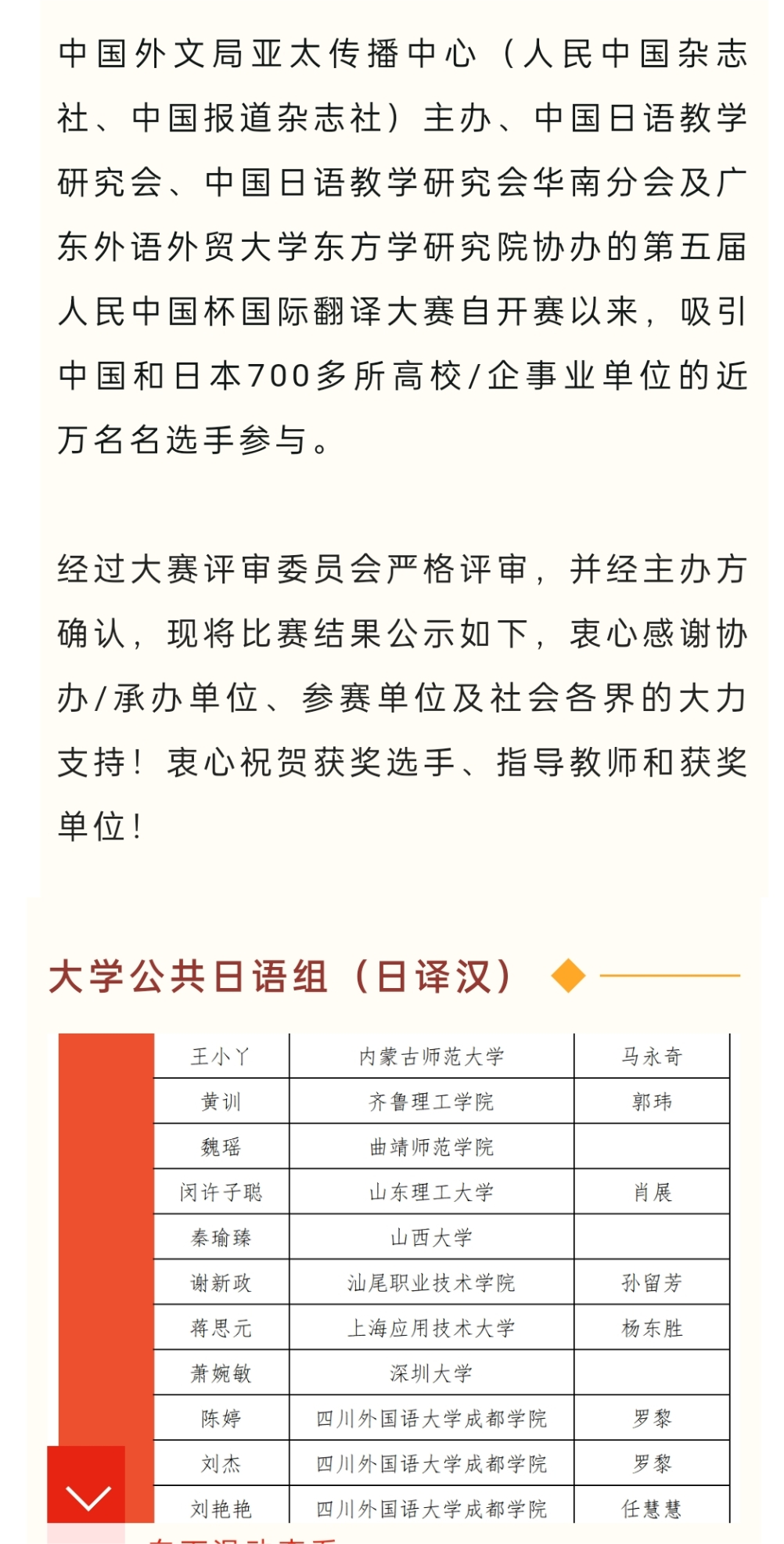 近日,由中国外文局亚太传播中心(人民中国杂志社、中国报道杂志社)和教育部日语专业虚拟教研室联合主办的第五届人民中国杯日语国际翻译(口笔译)大赛获奖名单已经揭晓,在此次比赛中,米兰官网王小丫同学取得了优异的成绩,荣获第五届"人民中国杯"日语国际翻译大赛笔译大学公共日语组日译汉二等奖。