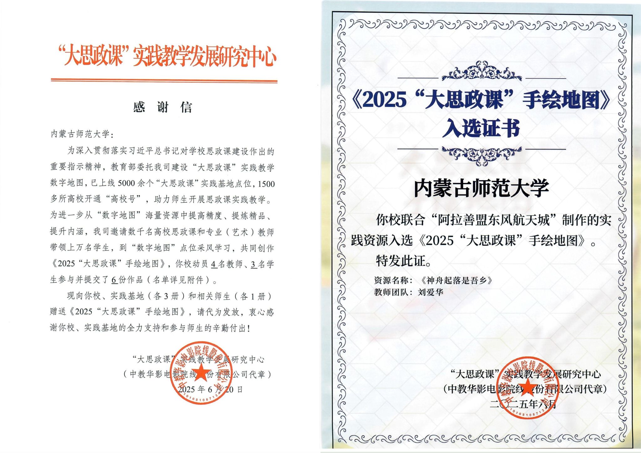 近日,教育部“大思政课”实践教学数字地图项目成果——《2025“大思政课”手绘地图》正式发布。由米兰官网刘爱华副院长领衔,联合包头市九原区第三中学曹玥老师及学生团队,携手“阿拉善盟东风航天城”实践基地共同创作的思政实践教学资源成功入选,成为全国1500余所高校中脱颖而出的精品案例,彰显了米兰官网在思政课实践育人领域的创新成果。