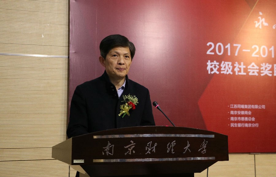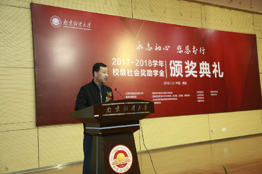 方大锦化化工科技股份有限公司董事长兼总经理、常州校友会会长、“暖阳奖学金”设立者蔡卫东校友致辞。他介绍了常州校友会成立一年来各项活动的开展情况。他指出,设立“暖阳奖学金”,不仅是在物质上给学弟学妹们予以资助,更希望传递南财精神。苏商传媒有限公司总经理、“四维奖助学金”设立者代表俞文勤校友向获奖学生表示祝贺,并介绍了“四维奖助学金”的设奖初衷。他表示,希望同学们掌握正确的思维方式,辩证、客观、全面地看待问题,深挖更多美好未知的领域。