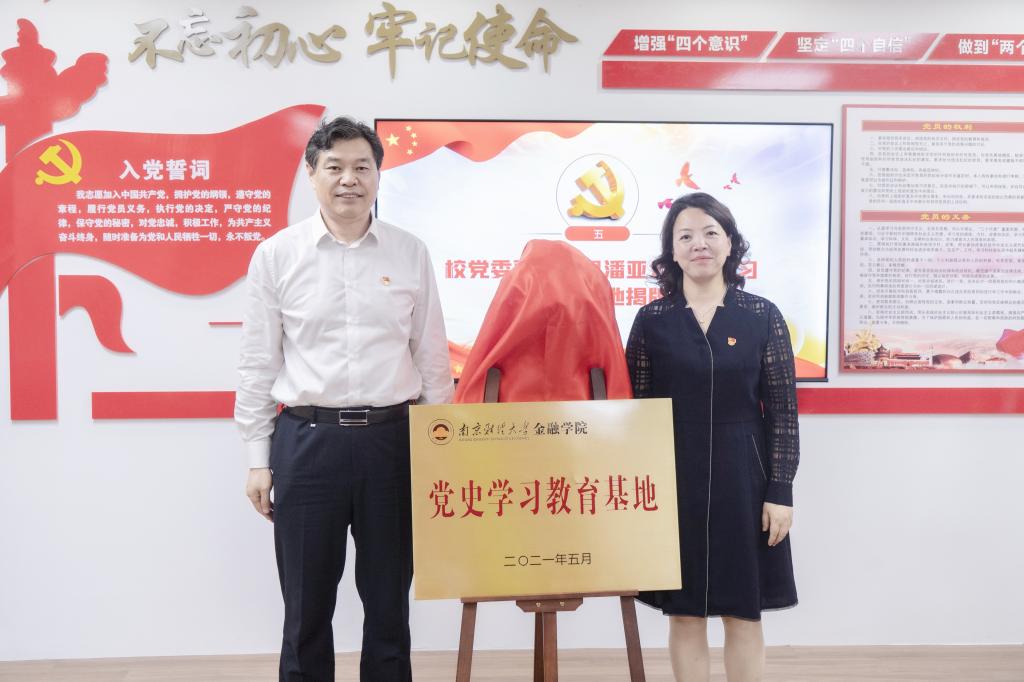 5月28日下午,金融学院在仙林校区德经楼507举行党史学习教育基地揭牌仪式。校党委副书记(正校级)温潘亚和金融学院党委书记李玉琴共同为党史学习教育基地揭牌。保险学会原秘书长张正宝,江苏银保监局纪监室调研员王彬,省保险学会信息宣传部副主任(主持工作)黄振凝,“金小鳄”党建思政工作室指导教师、马克思主义学院教授叶昌友,金融学院院长张成、党委副书记章冬斌、副院长郭文旌、金融学院系主任、党支部书记和师生代表参加此次活动。揭牌仪式由金融学院副院长姚定俊主持。