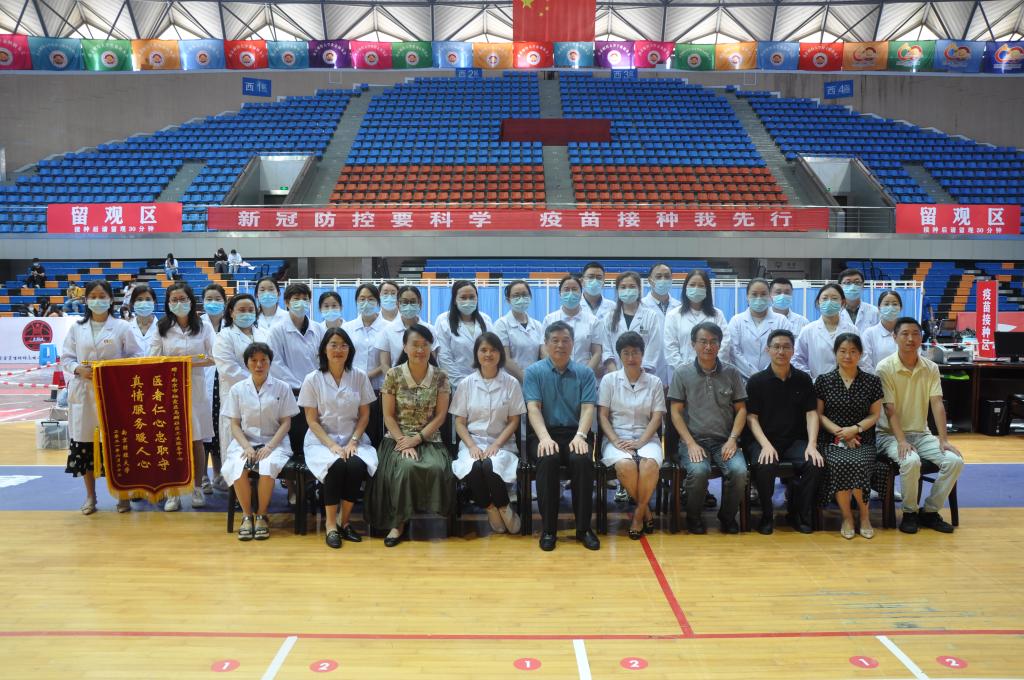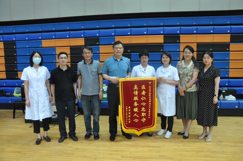 接种结束之际,党委副书记(正校级)温潘亚,党委常委、副校长李群,党委常委、统战部部长吕戎来到接种现场,代表学校向栖霞区马群社区卫生服务中心郑重献上一面写着“医者仁心忠职守,真情服务暖人心”的锦旗,对医护人员在伟德官网新冠疫苗接种工作中提供的细致服务表示诚挚感谢和崇高敬意。