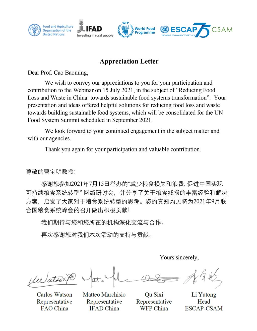 会后,主办方发来感谢信,感谢曹宝明教授分享关于粮食减损的丰富经验和解决方案,启发了大家对于粮食系统转型的思考,提供的真知灼见将为2021年9月联合国粮食系统峰会的召开作出积极贡献。