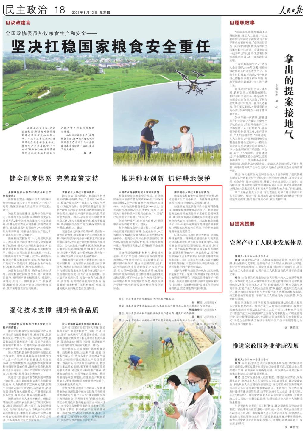 8月12日,《人民日报》在第18版“民主政治”版专题聚焦粮食安全,刊登《全国政协委员热议粮食生产和安全——坚决扛稳国家粮食安全重任》。全国政协委员、校长程永波围绕“抓好耕地保护”提出意见建议。
