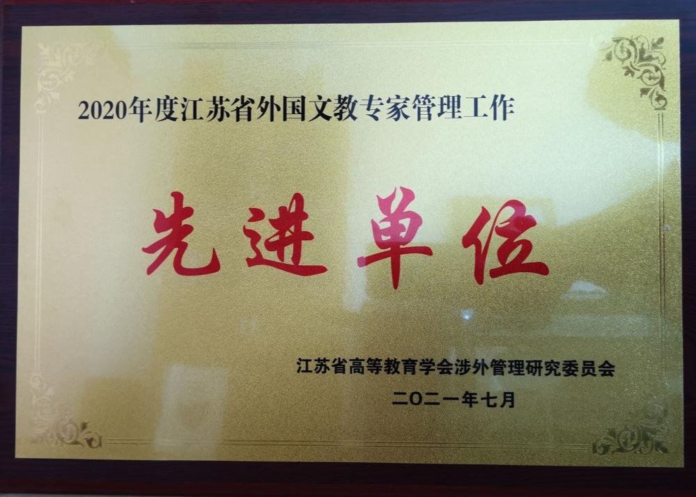 据悉,此荣誉是江苏省高等教育学会授予在外专外教工作中具有标杆性示范作用的高校,2020年度全省共有包括专科院校在内的31所高校获得“先进单位”的荣誉称号。