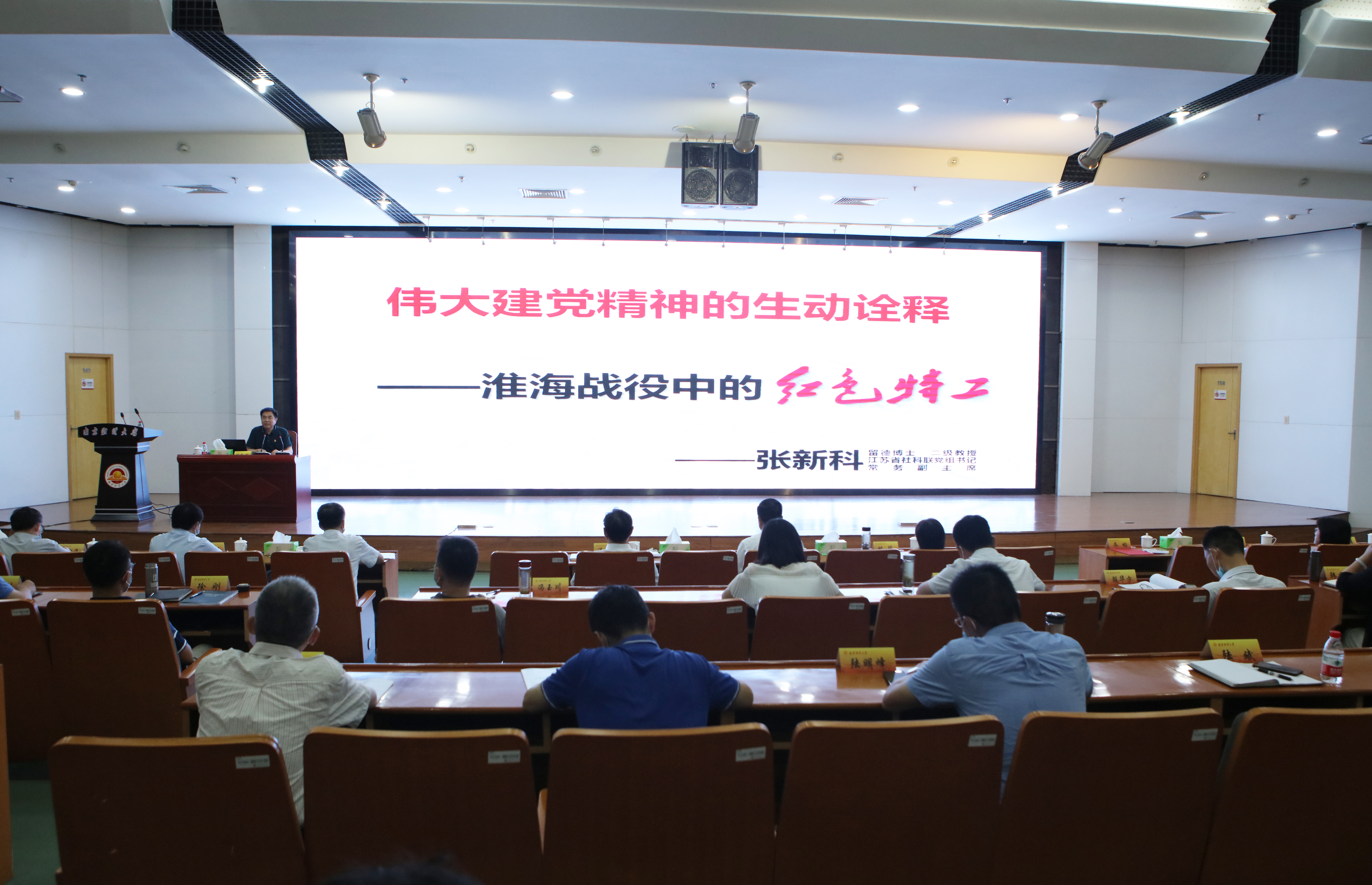 张新科书记以“伟大建党精神的生动诠释——淮海战役中的红色特工”为题,从“正面战场”“支前民众”“隐蔽战线”三个方面,向大家介绍了淮海战役的背景和过程,重点讲述了郭汝瑰、刘君湘、钱树岩等老一辈红色特工为革命事业牺牲奉献的感人事迹。张新科书记通过讲述一个个生动形象的故事、一位位舍生忘死的人物,将历史的磅礴画卷徐徐展开,让与会人员对“坚持真理、坚守理想,践行初心、担当使命,不怕牺牲、英勇斗争,对党忠诚、不负人民”的伟大建党精神有了更加深刻的理解和感悟。