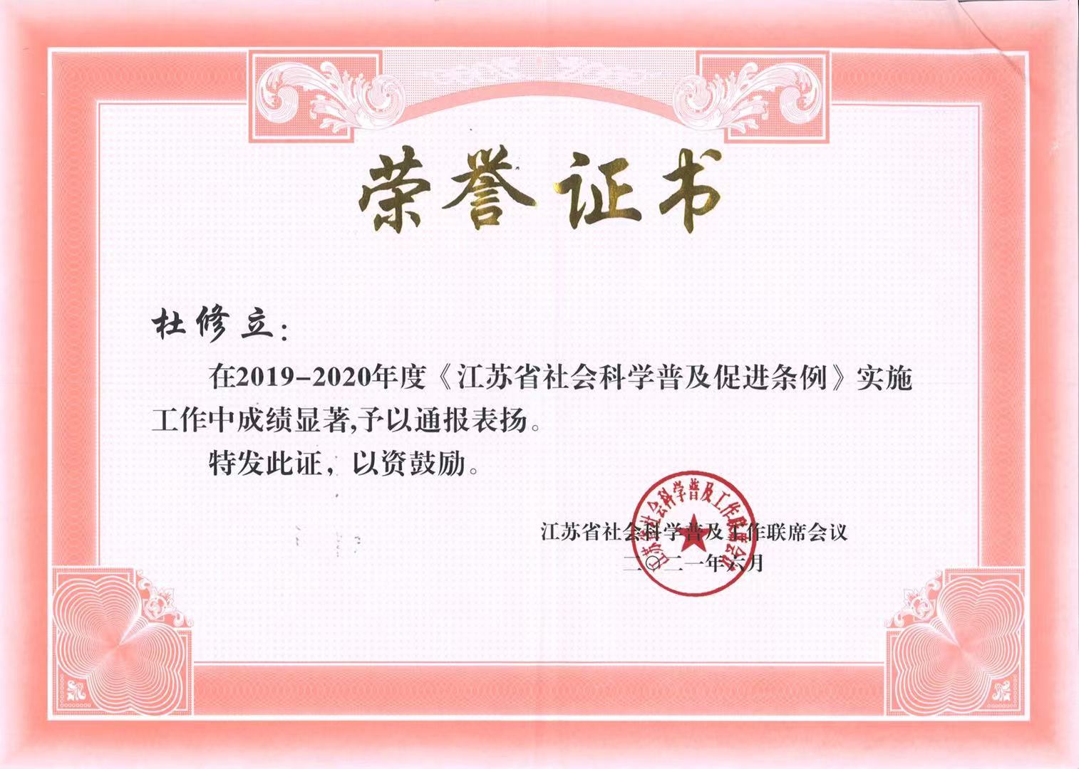 近期,省社会科学普及工作联席会议决定,对实施《江苏省社会科学普及促进条例》工作成绩显著的单位(部门)和个人予以通报表扬,并分别颁发奖牌和荣誉证书。伟德官网科研处被授予“2019-2020年度《江苏省社会科学普及促进条例》实施工作成绩显著单位”,校社科联秘书长、科研处副处长杜修立获先进个人表彰。