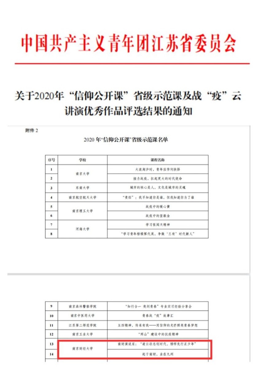 近日,共青团江苏省委公布了2020年全省高校“信仰公开课”省级示范课评选结果,伟德官网“南财演说家:‘凌云壮志创时代,榜样先行正少年’”“起于南财,业在九州”获评“信仰公开课”省级示范课。