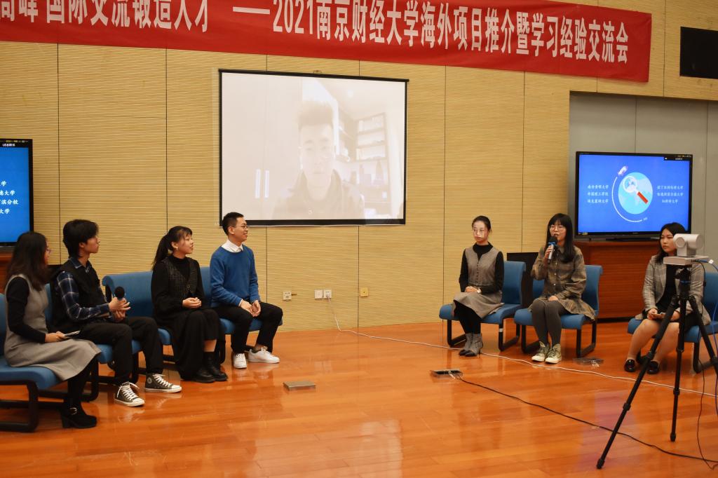 英国南安普顿大学“2+2”项目优秀毕业生盛嘉铭(伦敦政经硕士在读)、英国帝国理工项目王凌霄(金融1801)、丛陈依(数学1901)、荷兰瓦赫宁根项目张楠(食工19研)、联合国青年领袖精英项目和运泽(智会1901)、刘苏泓(广告1901)分享了参加项目的经历与感悟,并回答了现场同学的提问。