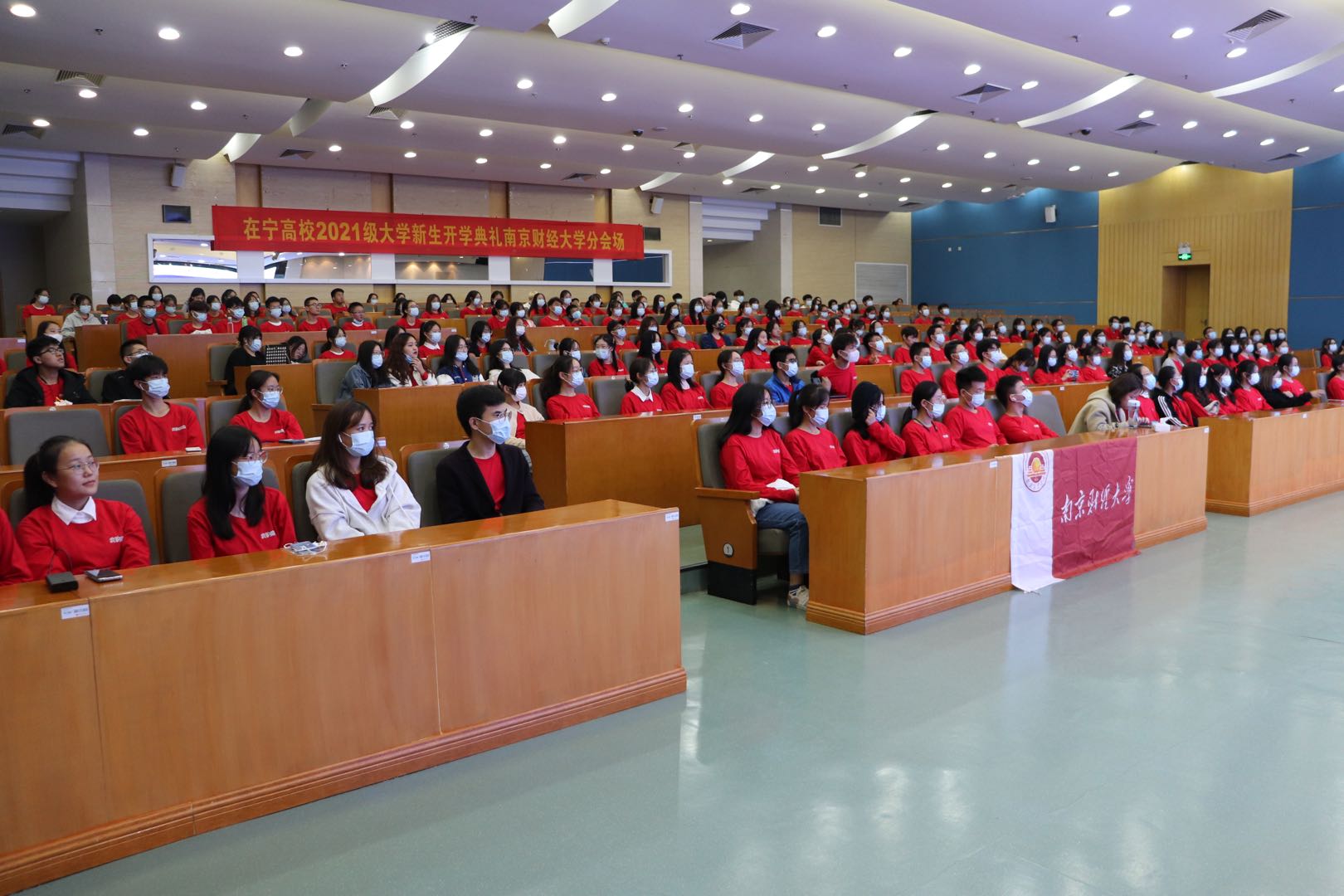 在仙林校区图书馆报告厅分会场,伟德官网新生代表们集中观看了开学典礼。在与主会场互动环节,当镜头切换到伟德bv国际体育分会场时,同学们精神昂扬向主会场挥手示意,向活动嘉宾和南京其他高校展示了南财学子们积极向上的精神面貌。