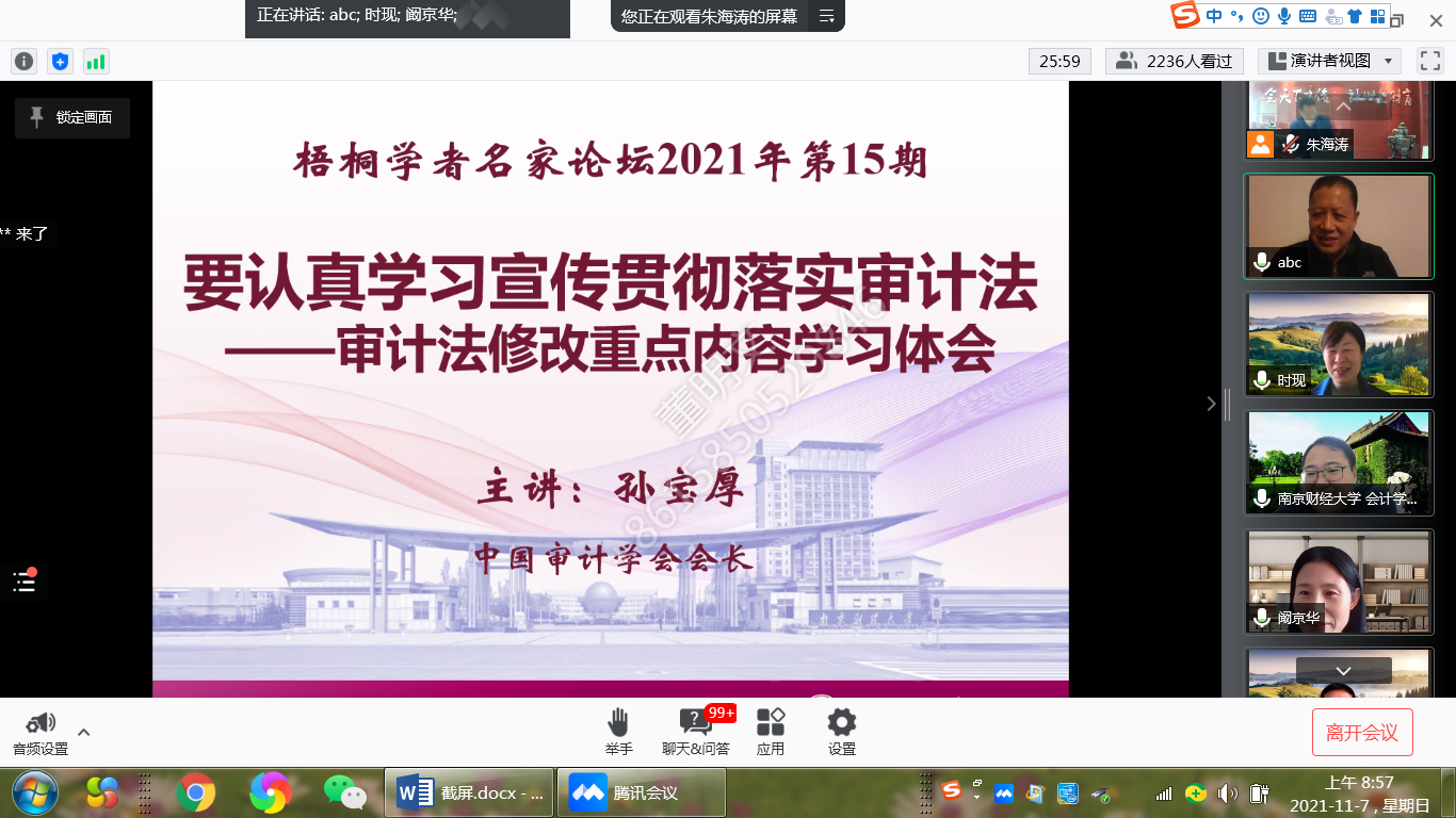 《全国人民代表大会常务委员会关于修改<中华人民共和国审计法>的决定》已由第十三届全国人民代表大会常务委员会第三十一次会议于2021年10月23日通过,自2022年1月1日起施行。为了全面掌握本次《审计法》的修改内容,11月7日上午,审计署原副审计长、中国审计学会会长孙宝厚应邀走进伟德官网会计学院梧桐学者名家论坛,通过腾讯会议,以“要认真学习宣传贯彻落实审计法——审计法修改重点内容学习体会”为题,就《审计法》的修改背景和修改重点内容进行深入讲解。论坛由党委常委、副校长时现主持,会计学院、红山学院部分教师和近1500名学生参加了本次论坛。