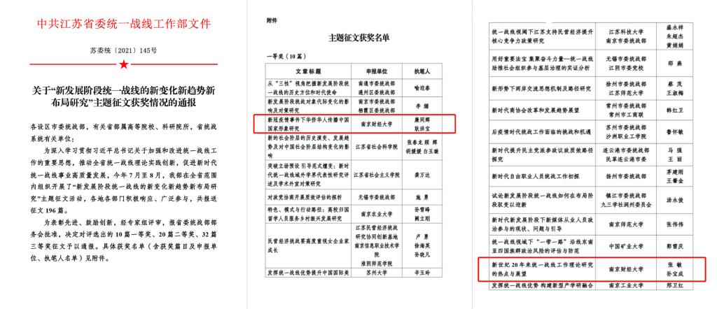 为深入学习贯彻习近平总书记关于加强和改进统一战线工作的重要思想,推动全省统一战线理论实践创新,促进新时代统一战线事业高质量发展,今年7月,省委统战部在全省范围内组织开展“新发展阶段统一战线的新变化新趋势新布局研究”主题征文活动。经个人申报、校内初评、择优推荐,伟德官网推荐的论文从全省196篇征文中脱颖而出,其中工商管理学院廉同辉副教授的论文《新冠肺炎疫情事件下华侨华人传播中国国家形象研究》获得一等奖,营销与物流管理学院张敏教授的论文《新世纪20年来统一战线工作理论研究的热点与展望》获得二等奖。