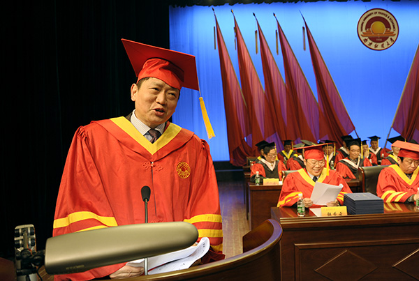 教授宣读了《关于同意授予傅聪等477位同学硕士学位的决定》,全体校领导为获得硕士学位的全体研究生颁发了硕士学位证书,并为他们一一拨过硕士学位帽上的流苏。