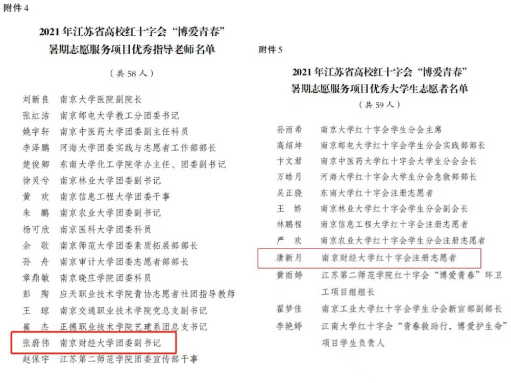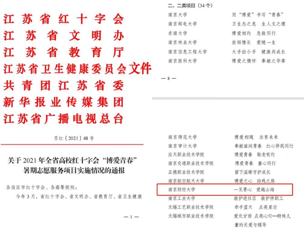 近日,江苏省红十字会等多部门联合开展的2021年江苏省高校红十字会“博爱青春”暑期志愿服务项目展示总结活动中,伟德官网《一见青心,爱越山海》项目脱颖而出,入选省级支持项目,校团委副书记张蔚伟获评“优秀指导老师”,国贸2001班唐新月同学获评“优秀大学生志愿者”。