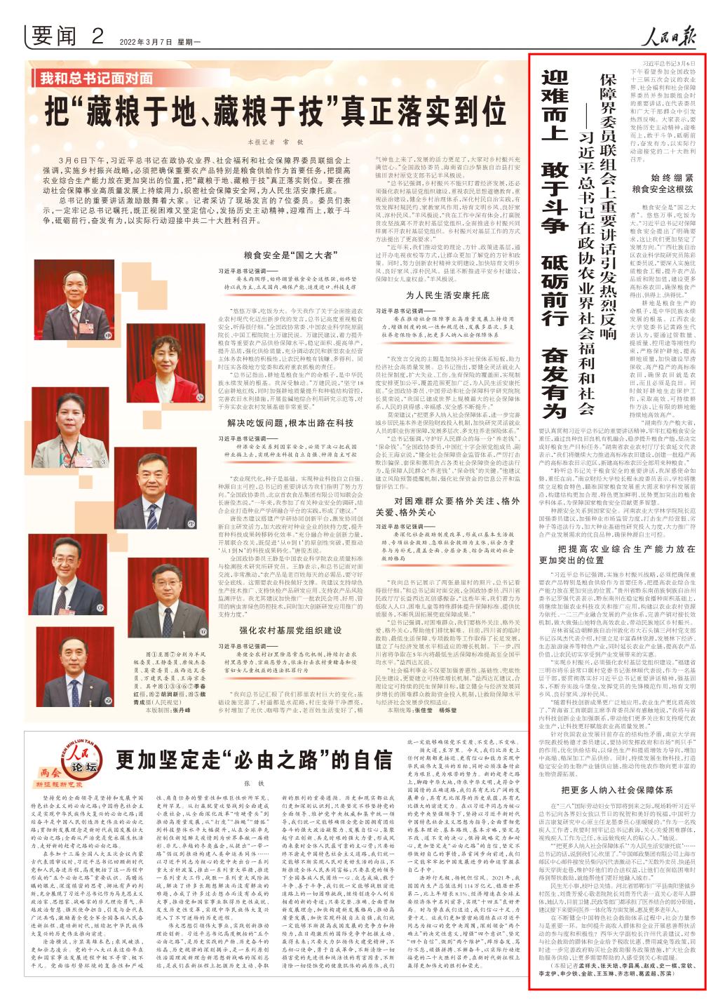 3月7日《人民日报》:迎难而上敢于斗争砥砺前行奋发有为——习近平总书记在政协农业界社会福利和社会保障界委员联组会上重要讲话引发热烈反响