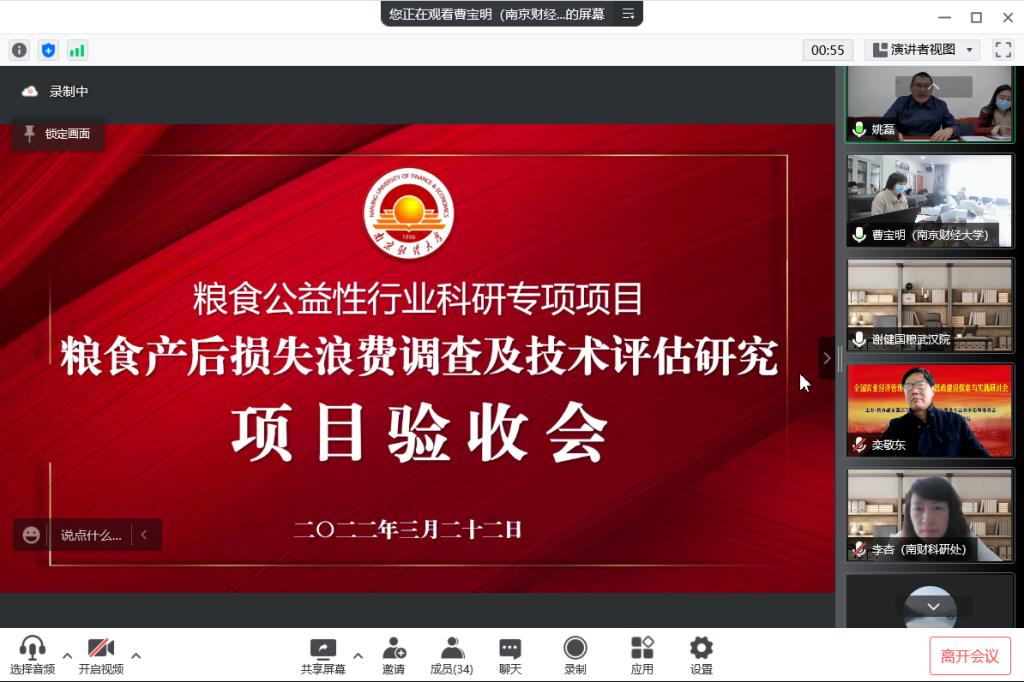 项目负责人、伟德官网粮食和物资学院院长曹宝明教授就项目研究工作开展情况、项目技术任务完成情况、项目经费预算执行与使用情况进行了详细汇报。专家组审阅了相关验收材料,经过质询讨论,一致同意该项目通过验收。专家组认为,该项目通过调查技术、统计技术、计量技术和模型技术的集成创新,构建了符合中国粮情实际的粮食损失调查评估指标体系、方法体系、数据体系、标准体系、模型体系、方案体系和对策体系。科学测定了2015-2016年主要粮油品种(稻谷、小麦、玉米、大豆、油菜籽、花生、马铃薯、甘薯)、不同环节(收获、农户储粮、储藏、运输、干燥、加工、销售、消费)、不同地区、不同规模、不同流通模式下的粮食产后损失浪费状况,粮食产后综合损失率为15.28%,油料产后综合损失率为14.96%;系统识别了粮食产后损失的影响因素;分类提出了有针对性的节粮减损措施,形成了数据库,搭建了粮食产后损失信息平台和爱粮节粮公共科普资源平台,为粮食行业全链条节粮减损、构筑无形良田、保障国家粮食安全提供了重要支撑。