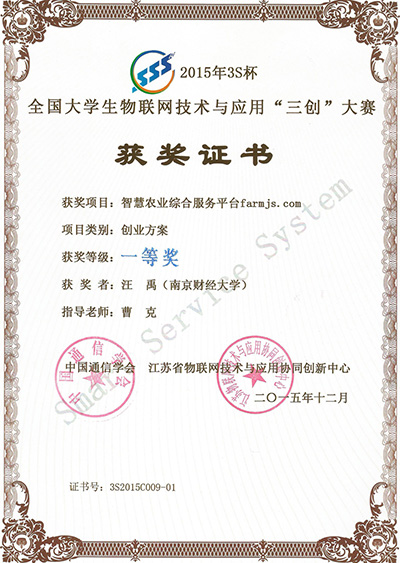 近日,由中国通信学会和江苏省物联网技术与应用协同创新中心联合主办的2015年3S杯全国大学生物联网技术与应用“三创”大赛决赛在南京邮电大学举行。来自清华大学、东南大学、苏州大学等31所高校的113个参赛项目参加了决赛。伟德官网研究生的科研项目“智慧农业综合服务平台” (成员:汪禹、曹伟、吴增明,指导教师:曹克)获得全国一等奖。