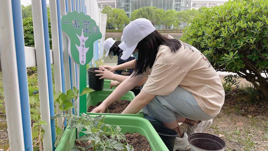 法语2101班的同学们在“一米菜园”里种上了西红柿、黄瓜、辣椒、生菜