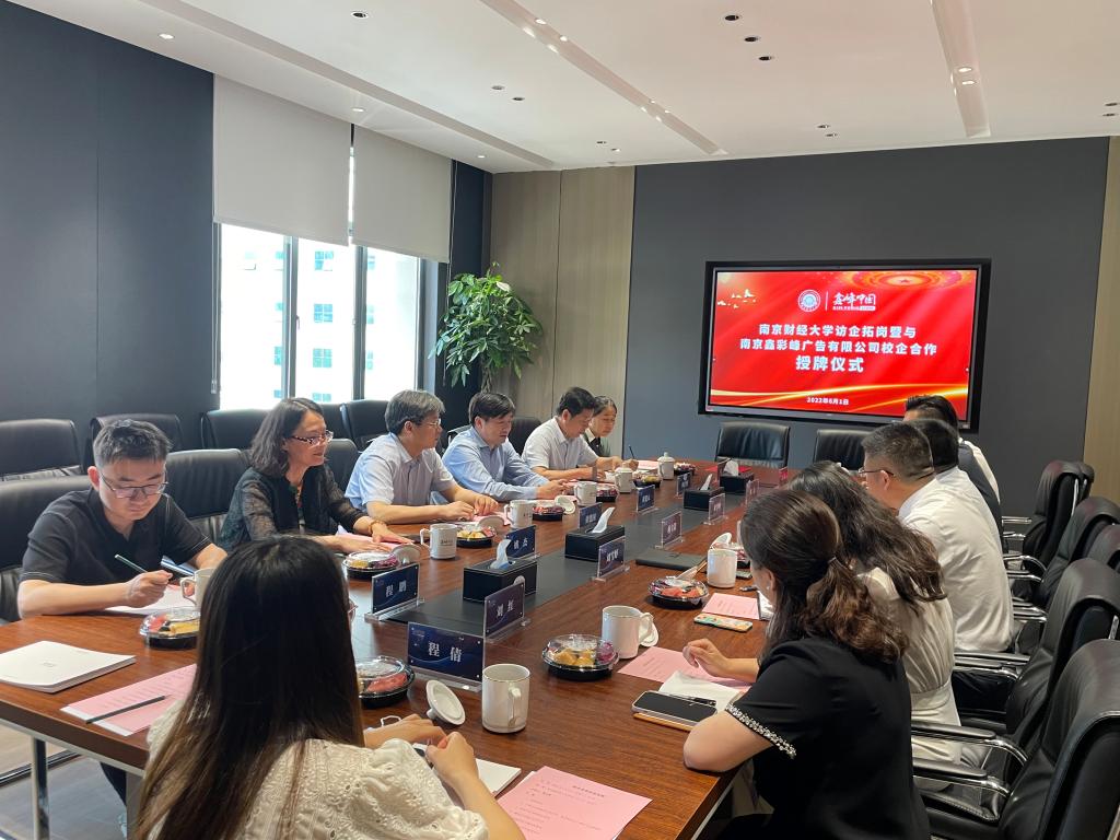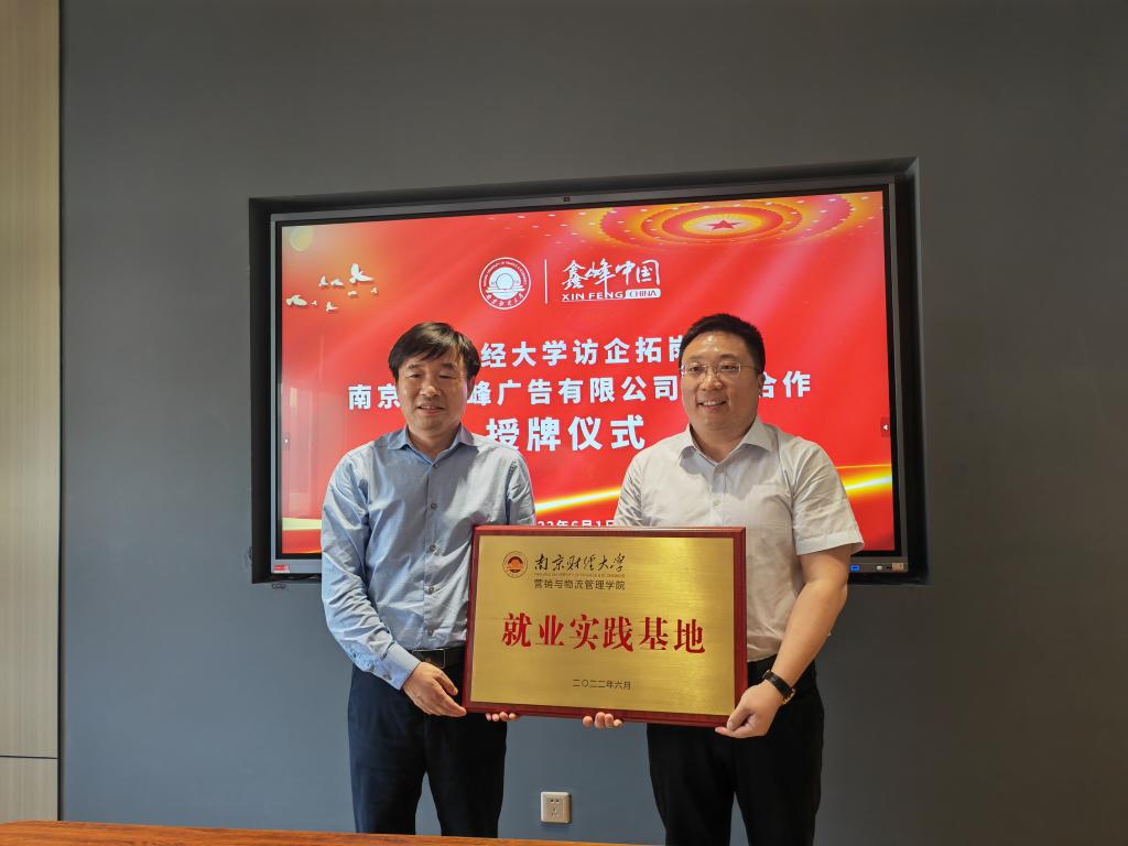 黄建元总会计师授予南京鑫彩峰广告有限公司(集团)“就业实践基地”牌匾,朱学峰董事长代表公司接牌。
