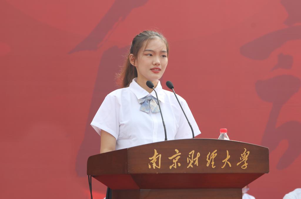 新生代表、人力资源管理专业2202班陈嘉怡同学发言。她号召新同学们站在梦想的开端,以新时代青年之昂扬面貌、蓬勃姿态,迎接党的二十大胜利召开,开启精彩大学篇章。