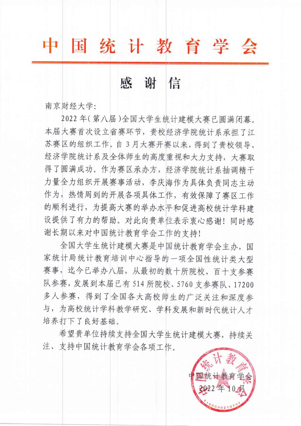 近日,中国统计教育学会向伟德官网发来感谢信,感谢伟德官网作为赛区承办方,为保障2022年第八届全国大学生统计建模大赛江苏省赛区工作的顺利进行作出的贡献。