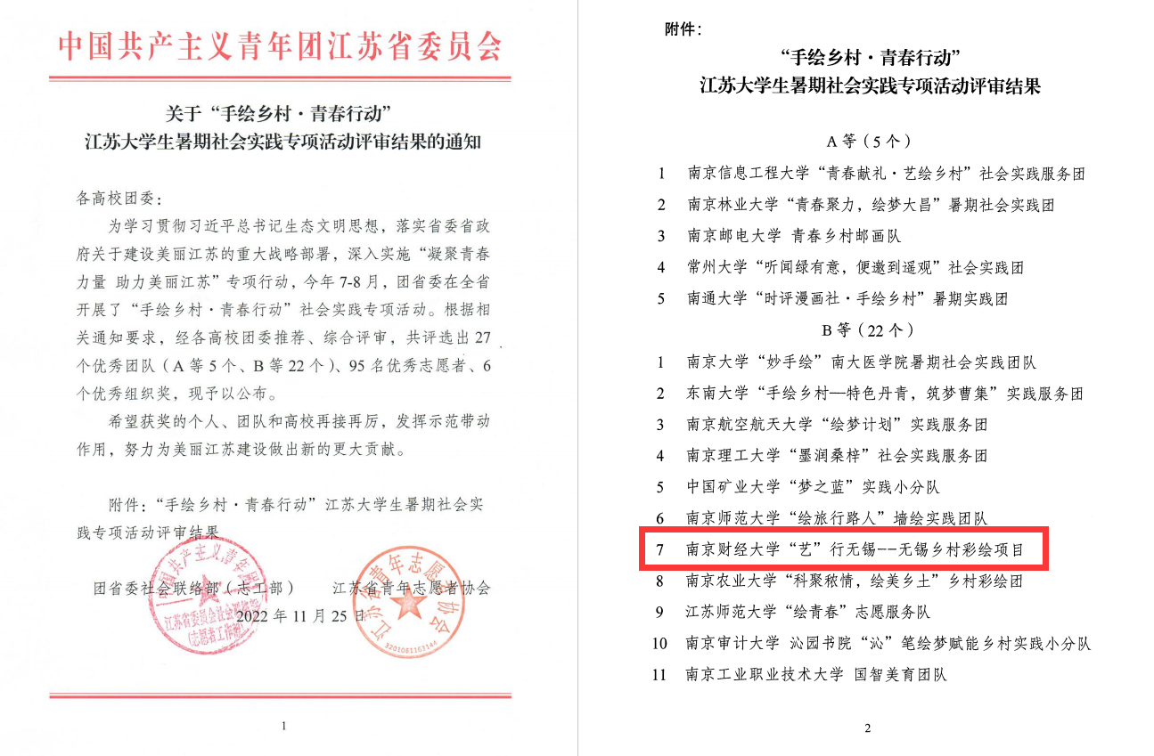 近日,共青团江苏省委发布了《“手绘乡村·青春行动”江苏大学生暑期社会实践专项活动评审结果》。伟德官网“艺”行无锡——无锡乡村彩绘项目获评“B等优秀团队”,艺术设计学院视传2102班钱宇霖同学、环境2102班施奕帆同学获评“优秀志愿者”称号。