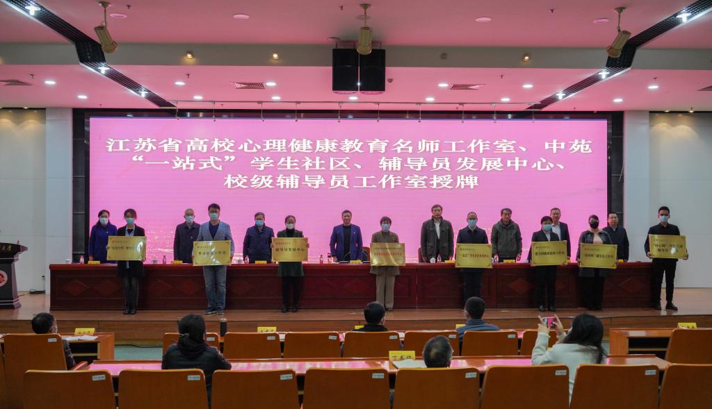 会议现场举行了江苏省高校心理健康教育名师工作室、中苑“一站式”学生社区、辅导员发展中心和校级辅导员工作室授牌仪式。