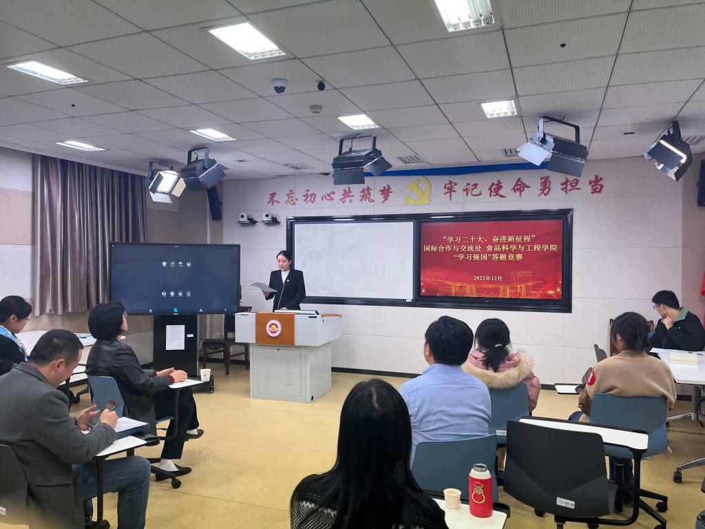 为深入学习贯彻党的二十大精神,在师生党员中掀起学习热潮,加强师生党员思想政治教育工作,12月8日下午,党委常委、副校长、食品科学与工程学院研究生第一党支部政治辅导员邱伟芬教授在仙林校区工科楼214教室与国际合作与交流处全体工作人员、食品科学与工程学院师生代表共同参加了“学习二十大 奋进新征程”主题党日活动,活动分为微党课与“学习强国”知识竞赛两个环节。