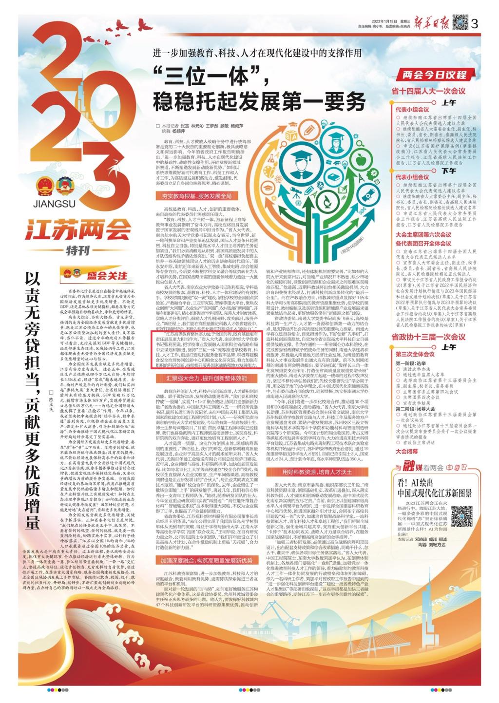 1月18日《新华日报》:“三位一体”,稳稳托起发展第一要务
