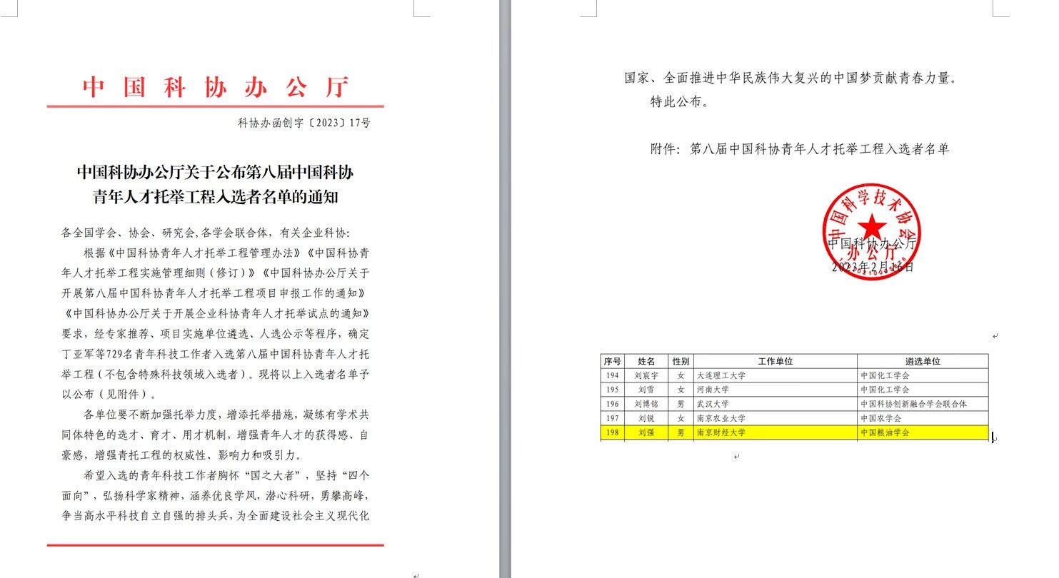 近日,中国科协办公厅公布了第八届青年人才托举工程入选名单,伟德官网食品科学与工程学院刘强博士在粮油及其食品储藏领域作出了创新性研究贡献,经专家推荐、项目实施单位遴选、人选公示等程序,成功入选青年人才托举工程,这是伟德官网青年教师首次获此殊荣。