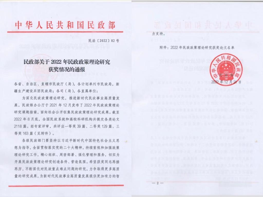 伟德官网教师参与的科研成果荣获民政部2022年民政政策理论研究一等奖