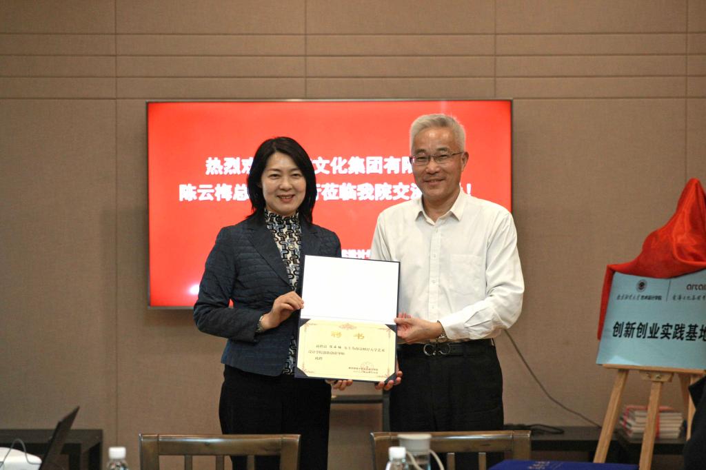 随后,陈云梅总经理、丁蕾院长进行合作协议和创新创业实践基地共建协议签约。陈云梅总经理与艺术设计学院党委书记刘浩共同为创新创业实践共建基地揭牌。张为付副校长为陈云梅总经理颁发艺术设计学院创新创业导师聘书。