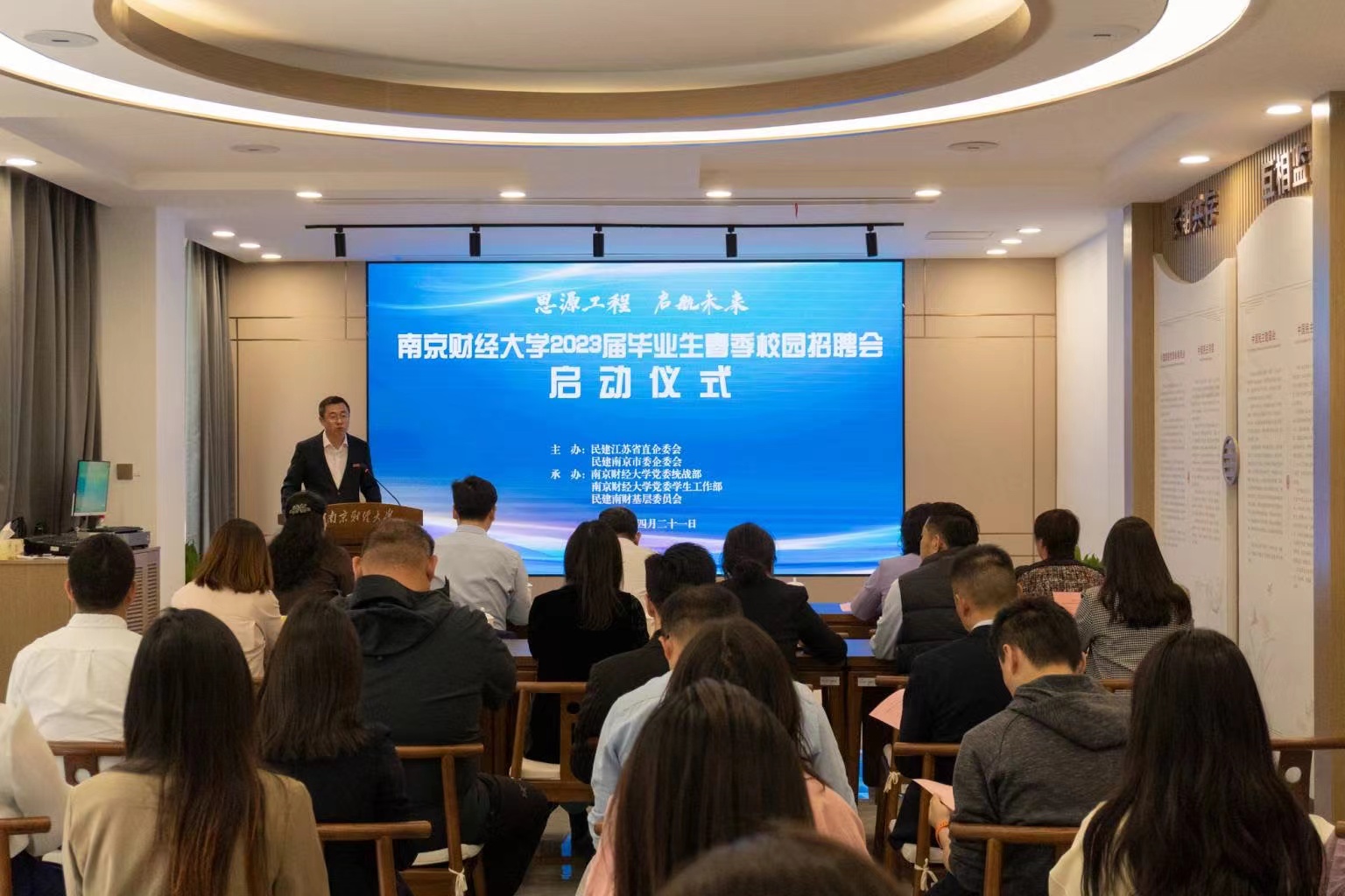 4月21日下午,“思源工程 启航未来”民建企业家进校园暨2023届毕业生春季校园招聘会在仙林校区举行。江苏省政协副秘书长、民建江苏省委专职副主委常本春,党委常委、副校长赵国栋,南京市政协副秘书长、民建南京市委专职副主委杨卫青出席招聘会启动仪式。民建江苏省直、民建南京市委相关领导和企业家代表,伟德官网党委统战部、学生工作部相关领导,校民建委员会部分会员及毕业生代表参加启动仪式。启动仪式由党委常委、统战部部长吕戎主持。