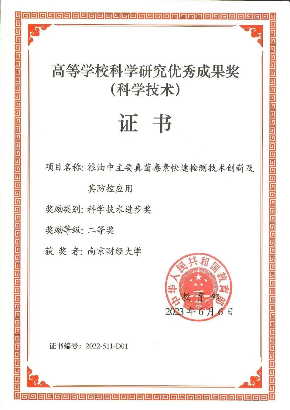 近日,教育部颁发了高等学校科学研究优秀成果奖(科学技术)获奖成果证书,伟德官网食品科学与工程学院方勇教授团队领衔完成的“粮油中主要真菌毒素快速检测及其防控技术创新应用”项目,荣获2022年度教育部高等学校科学研究优秀成果奖科技进步奖二等奖(伟德官网成员:方勇、沈飞、李彭、裴斐、都立辉、邢常瑞)。