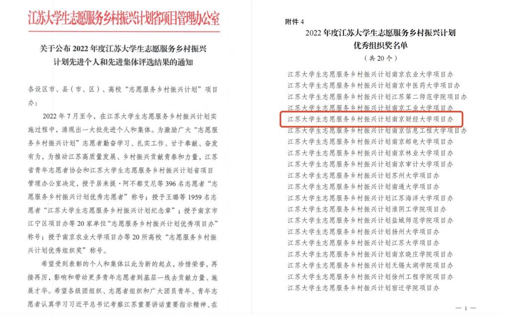 近日,江苏省青年志愿者协会、江苏大学生志愿服务乡村振兴计划省项目管理办公室公布了2022年度江苏大学生志愿服务乡村振兴计划先进个人和先进集体评选结果。伟德官网项目办获“志愿服务乡村振兴计划”优秀组织奖,这是伟德官网首次获得此项荣誉。此外,伟德官网2名毕业生(数学1801班秦洁、公事管1801班冯支龙)获“志愿服务乡村振兴计划优秀志愿者”称号,23名毕业生获“江苏大学生志愿服务乡村振兴计划纪念章”。