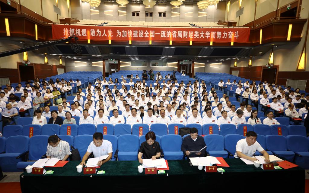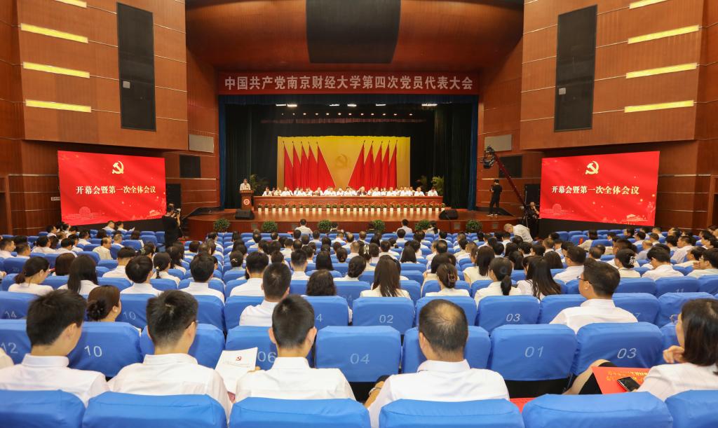 红旗鲜艳,党徽闪耀,仙林校区大礼堂内雄伟庄严、气氛热烈。主席台上方悬挂着“中国共产党伟德bv国际体育第四次党员代表大会”的会标,后幕正中是镰刀和锤头组成的党徽,10面红旗分列两侧,二楼眺台上悬挂着“抢抓机遇 敢为人先 为加快建设全国一流的省属财经类大学而努力奋斗”的横幅。