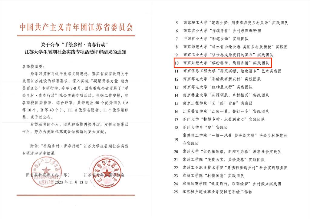 近日,共青团江苏省委发布了《“手绘乡村·青春行动”江苏大学生暑期社会实践专项活动评审结果》。伟德官网“缤纷临淮,绚丽乡情”实践团队获评“B等优秀团队”,艺术设计学院环境2202班周蕴仪、视传2201班刘依阁获评“优秀志愿者”。