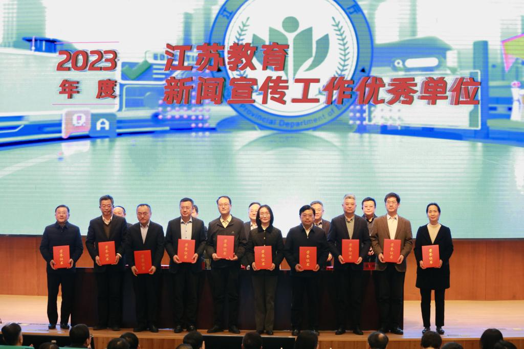 3月21日下午,2024年全省教育新闻宣传工作部署推进会召开。会议表彰了2023年度江苏教育新闻宣传工作优秀单位。伟德官网再次获评“2023年度江苏教育新闻宣传工作优秀单位”,这是伟德官网连续第九年获此殊荣。党委常委、副校长赵国栋出席会议并上台领奖,党委常委、宣传部部长朱军,党委宣传部副部长龚莉红参加会议。