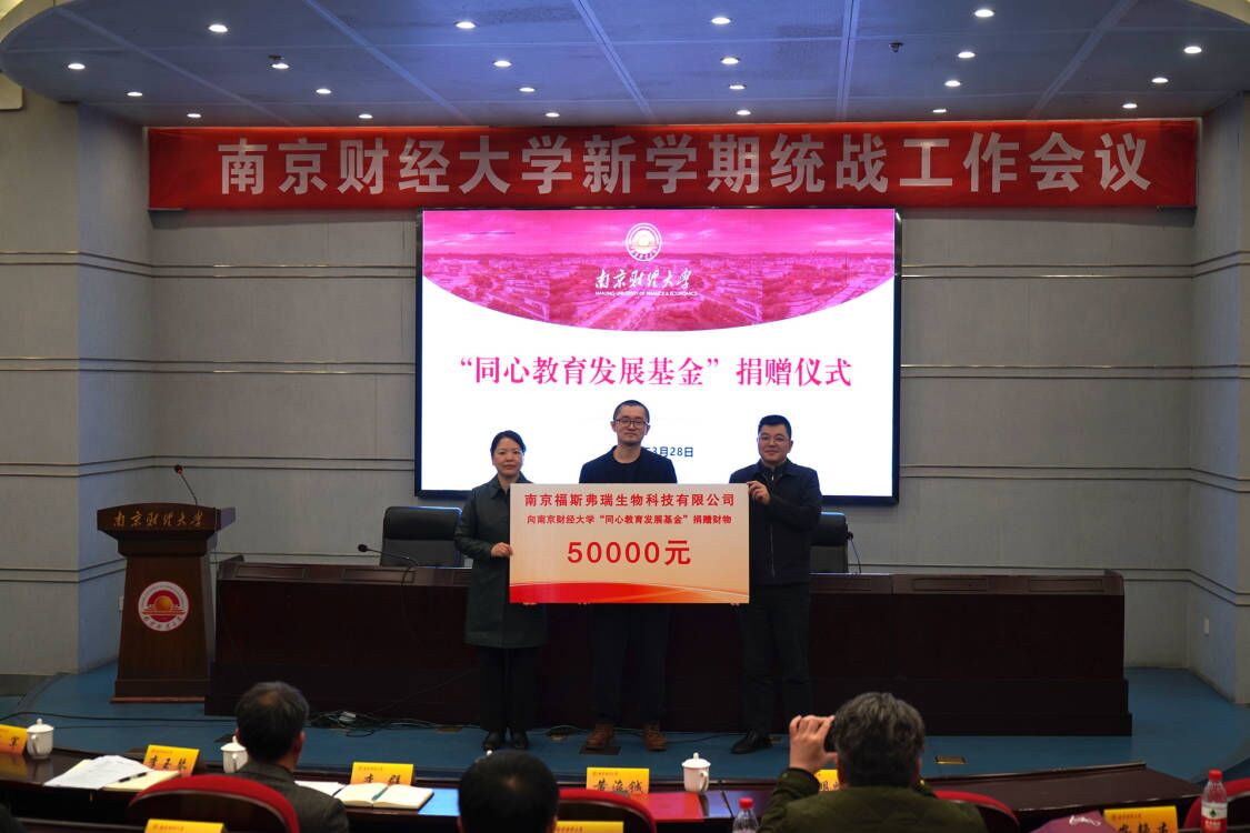 会议还举行了“同心教育发展基金”捐赠协议签约仪式。李群副书记为爱心企业家、南京福斯弗瑞生物科技有限公司总经理黄浚铖颁发捐赠证书。“同心教育发展基金”由校致公党支部联系南京福斯弗瑞生物科技有限公司发起,首批获赠财物五万元。