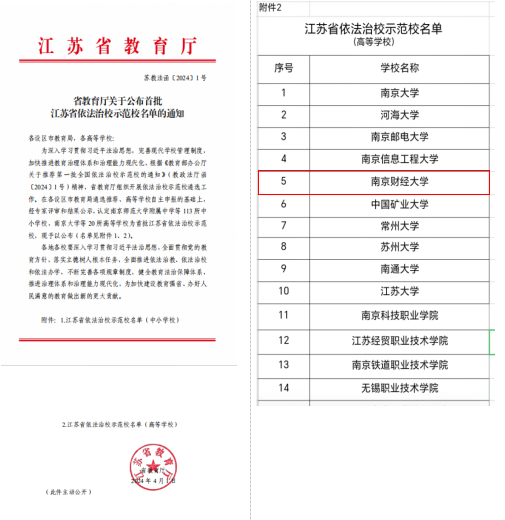 近日,江苏省教育厅根据《教育部办公厅关于推荐第一批全国依法治校示范校的通知》(教政法厅函〔2024〕1号)精神,组织开展依法治校示范校遴选工作,伟德官网获评首批“江苏省依法治校示范校”。