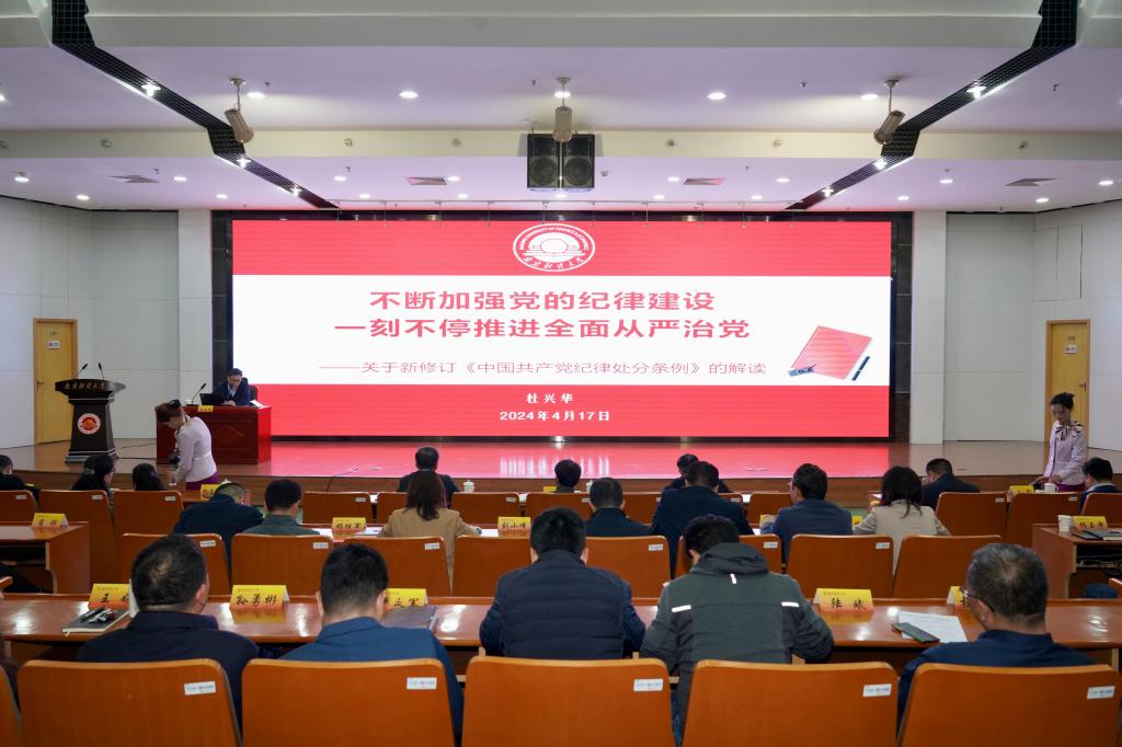 杜兴华副书记紧紧围绕主题,突出重点,结合条例具体条文和工作实际,从深刻认识修订《条例》的重要意义、准确把握《条例》修订的主旨要义、《条例》主体内容和新增修订部分的重点解读、以严明的纪律推进党的自我革命贯彻落实好《条例》等四个方面开展讲座。