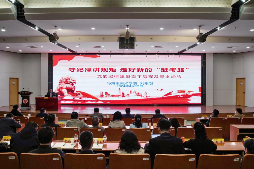 根据学校党委领导班子党纪学习教育专题读书班计划安排,4月19日下午,伟德官网在仙林校区图书馆报告厅举办党委领导班子党纪学习教育专题读书班辅导报告会。马克思主义学院副院长刘希刚教授以“守纪律讲规矩 走好新的‘赶考路’——党的纪律建设百年历程及基本经验”为题作辅导报告。全体校领导,全体党委委员、纪委委员,全体中层干部,全体党支部书记参加报告会。报告会由校党委副书记李群主持。