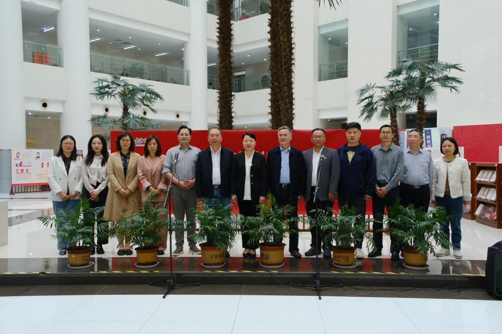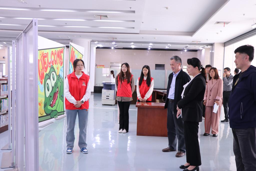 全体领导和师生合影留念,并在图书馆大厅参观数据库展、“金小鳄”工作站以及雨花台烈士纪念馆馆藏珍贵文物故事展。