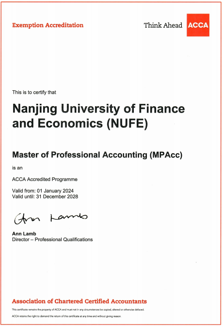 2024年1月1日至2028年12月31日期间,就读于伟德官网会计专硕(MPAcc)学生有资格申请ACCA专业资格九门免试(在校期间即可享受九门有条件免考)。这意味着,只需要通过四门ACCA战略专业阶段课程(必考二门:Strategic Business Leader, Strategic Business Reporting;选考二门:Advanced Financial Management, Advanced Performance Management, Advanced Taxation, Advanced Audit and Assurance),毕业后即可获得ACCA专业资格全科通过证书。