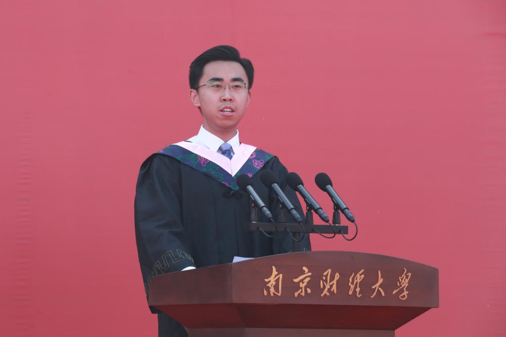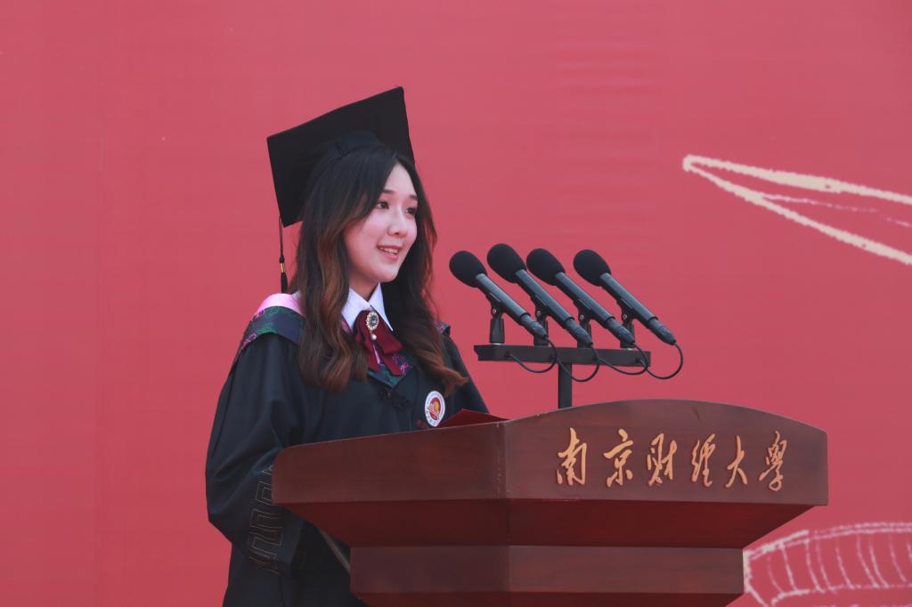 毕业生代表、新闻学院新闻2001班本科生马驭发言,回顾了在校的求学时光,表示将勇敢面对未来人生旅途中无数新的际遇、新的挑战、新的收获、新的惊喜,不忘母校栽培、铭记校训精神,奋力跑出新时代南财青年的最好成绩!