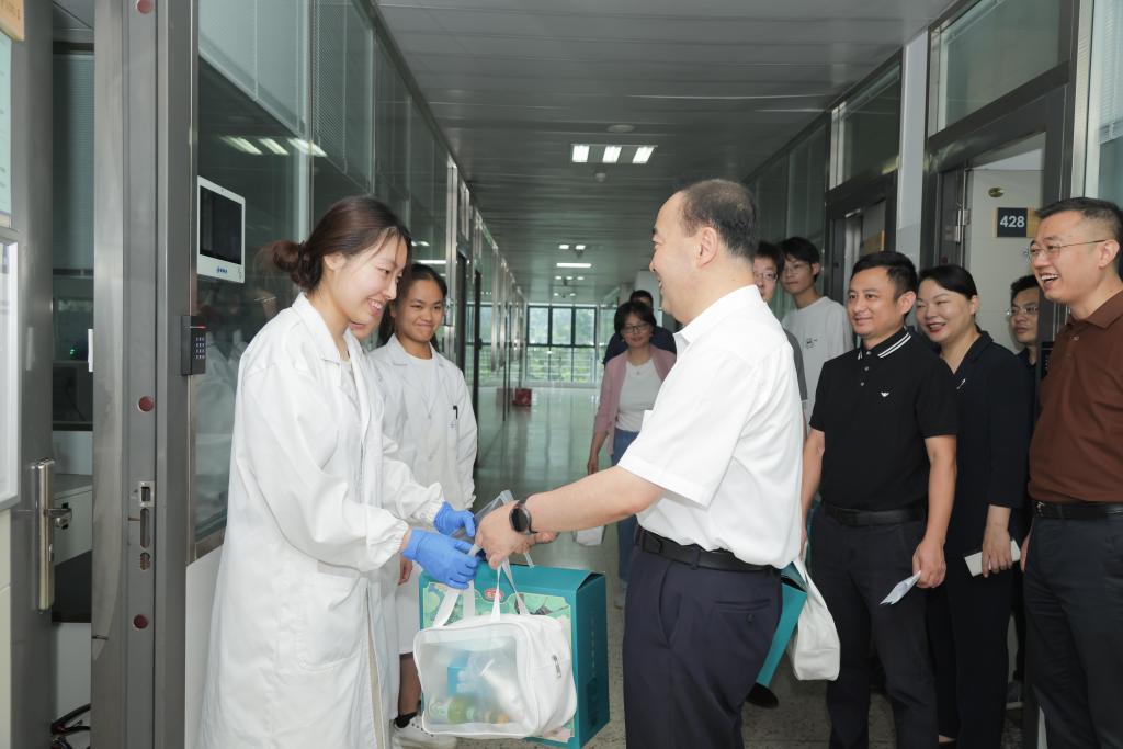 在食品科学与工程学院实验室,程永波校长认真听取安全工作情况汇报,重点了解实验室安全责任落实、危险化学品存放及使用、安全规章制度落实等情况,强调实验室安全是学校教学、科研工作有序开展的重要保障,要高度重视暑期实验室安全管理工作,全面落实实验室安全责任体系,压实实验室安全管理责任,细化实化各类应急预案,做好专人值班和日常巡检,确保安全责任到岗到人,切实保障实验室各项工作安全平稳运行。程永波校长与实验室的同学们热情交谈,了解大家的学习、科研、生活情况,并叮嘱大家要充分利用假期宝贵时间,做好科研、多出成果。要合理安排学习与生活,劳逸结合、健康生活,提高安全防范意识,度过一个充实而有意义的假期。