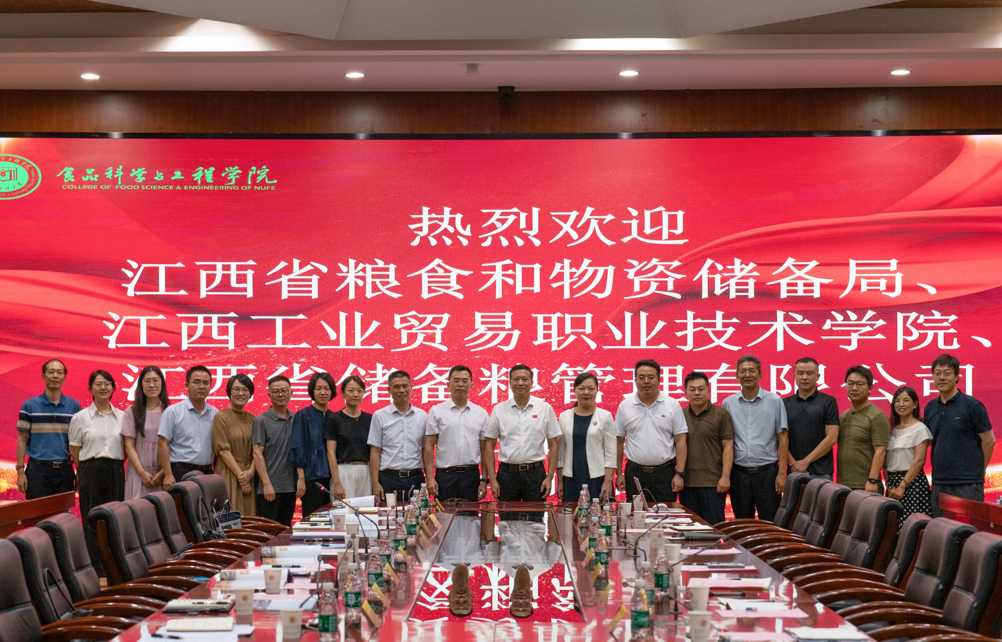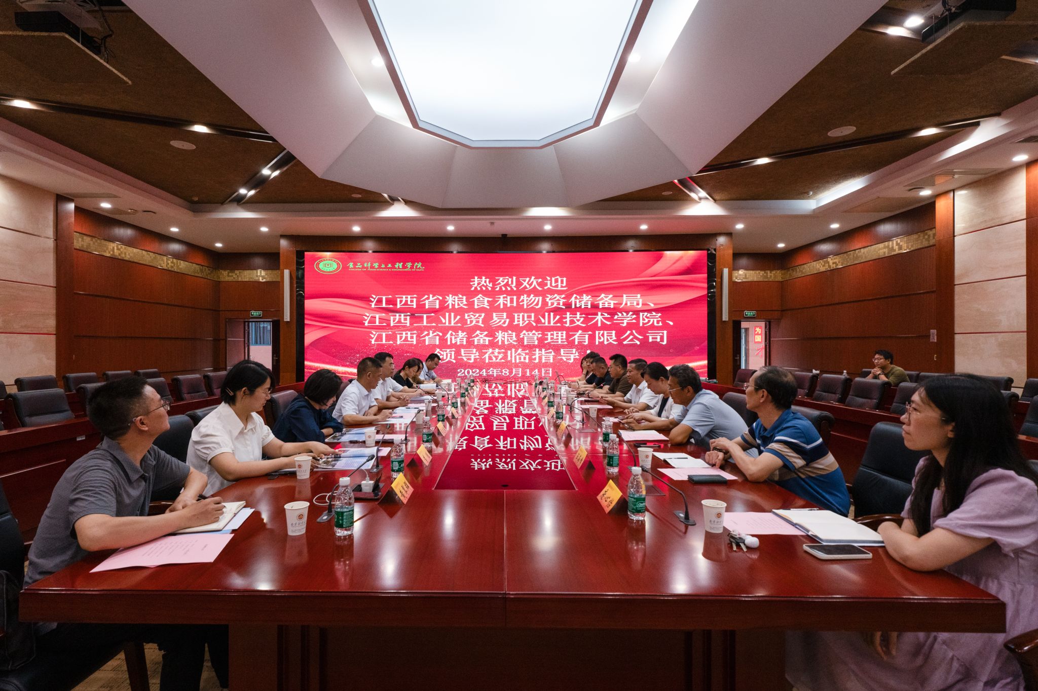 8月14日,江西省粮食和物资储备局副局长丁宏,江西省工业贸易职业技术学院党委书记、院长万晓波,江西省储备粮管理有限公司副总经理李灵萍等一行来伟德官网调研交流。校党委书记张利民,党委常委、副校长李煜出席座谈会。江西省粮食和物资储备局规划与物资储备处处长杨学文、安全仓储与科技处三级调研员章凌燕;江西省工业贸易职业技术学院产学研培发展中心主任万颖、党委宣传部副部长冯训阳;伟德官网党政办主任郑锷,食品科学与工程学院党委书记许文彪,校党政办副主任张亦佳、尹梦雨以及食品科学与工程学院有关专家教授参加座谈会。