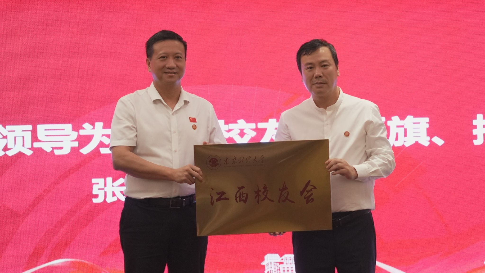 张利民书记向刘智辉会长授予江西校友会会旗、会牌。李煜副校长、郑锷主任、朱红根处长先后为当选的江西校友会负责人颁发聘书。